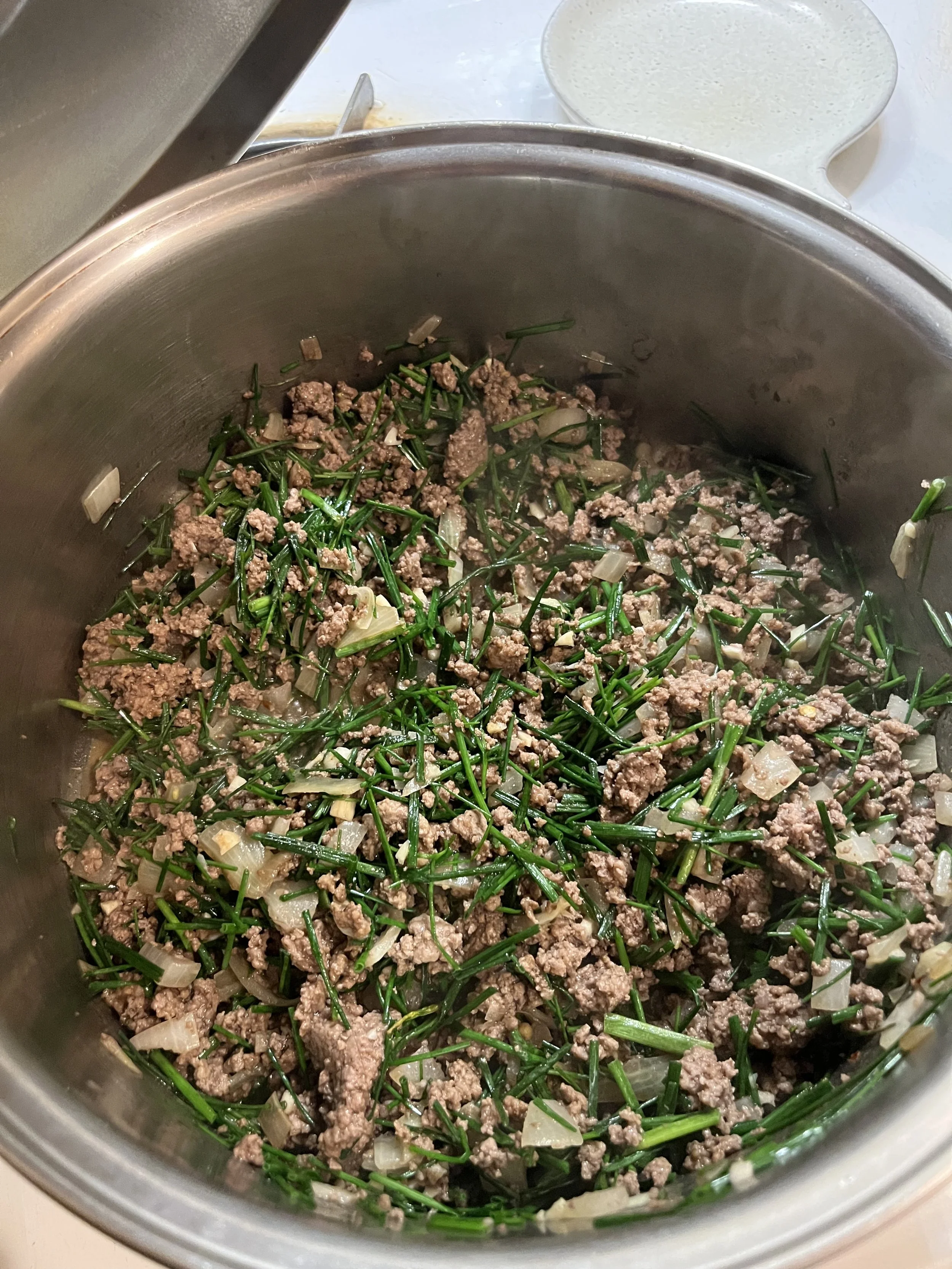 Wild Chives Stir Fry: Scallion or green onion stir fry is a popular Chinese dish that’s easy to make, with virtually limitless variations. Here, simply substitute the scallion for wild chives, which grows abundantly the first of Spring. As wild chive is smaller and its flavor less intense than its Allium cousin, you can triple the amount recommended in the recipes (as a bonus, wild chives are considered to contain higher amounts of nutrients and minerals vs. scallion). We recommend chopping it up in half to one-inch segments, and just follow the recipe. Here are a few of our favorites: Mushroom & Green Onion Stir Fry, Scallion & Beef Stir Fry, Chicken, Ginger & Scallion Stir Fry. (Pictured below is a variation on the Scallion & Beef Stir Fry, but using bison burger meat instead.)